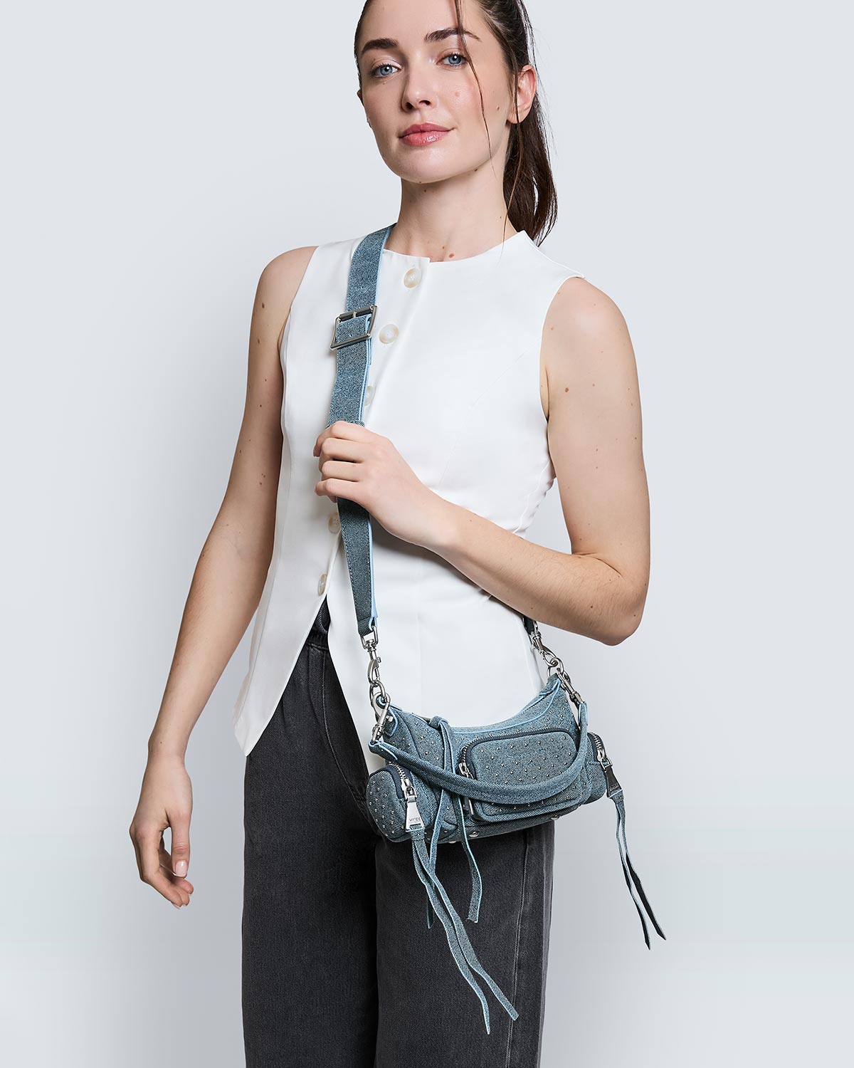 - Adjustable and removable crossbody strap